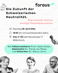 Die Neutralität wird heute international und national kontrovers diskutiert. Mit drei hochkarätige Gäst:innen habt ihr die seltene Gelegenheit für direkten und interaktiven Austausch. Wir stellen provokante Thesen in den Raum und diskutieren darüber lebendig, konstruktiv und mit Platz für eure Meinungen! Kein Frontalvortrag, sondern eine lebendige Debatte mit Raum für deine Stimme mit anschliessendem Apéro zu Vertiefung der Gespräche. Wir freuen uns auf eine inspirierende Runde am Dienstag, 28. April 2026 gemeinsam mit Expert:innen zum Thema: Wie neutral soll die Schweiz sein – und was bedeutet das heute?