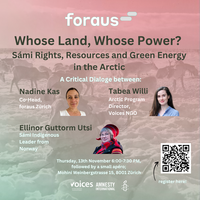 The rapid green energy transition is transforming the Arctic, but at what cost for Indigenous communities? This public event brings together Sámi leader Ellinor Guttorm Utsi, Tabea Willi (Arctic Program Director, Voices NGO), and Nadine Kas (foraus Zürich) to discuss conflicts and consent around land use, resource extraction, and green energy development in Sápmi. We will dive into the challenges of safeguarding Sámi rights, the paradoxes of “green colonialism,” the importance of free, prior, and informed consent, and the broader geopolitical forces shaping the region.