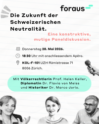 Am Donnerstag, 28. Mai 2026, laden wir Euch zu einer Paneldiskussion von der Zürcher Regiogruppe von foraus ein. Gemeinsam mit Expert:innen diskutieren wir: Wie neutral soll die Schweiz sein – und was bedeutet das heute?