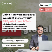 Am Dienstag 7. April ab 12:30 Uhr diskutieren wir über die Beziehungen zwischen China und der Schweiz, insbesondere auch im Hinblick auf die Revision des Freihandelsabkommens zwischen den beiden Parteien (wie auch thematisiert in unserer neuen Publikation), sowie mögliche Auswirkungen einer chinesischen Übernahme Taiwans auf die Beziehungen der Schweiz zu den beiden Staaten.